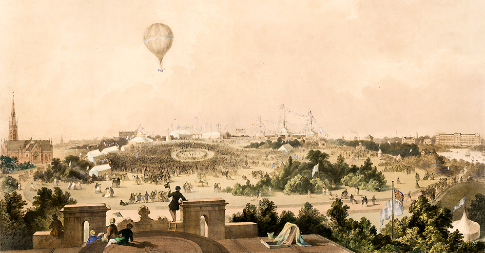 This animated view of Princes Park, complete with hot air balloon, celebrates the Fancy Fair that took place in the park in August 1849. It was produced by John Isaac, Draughtsman & Lithographer, of 62 Castle Street.