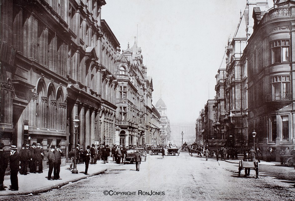 Amazingly, World War Two bombing raids left most of the street relatively intact, with two major exceptions: the Post Office (reconstructed and still there), and the large, domed Government building in the middle distance that once housed the Tax Office and a number of courts. It was badly damaged and finally demolished in 1948, its place taken by an unsightly ‘temporary’ car park. It was finally replaced in 2018 by a new multi-story car park (and a large, still-empty retail unit), a development not unattractive in its own right but hardly in keeping with its Victorian neighbours.