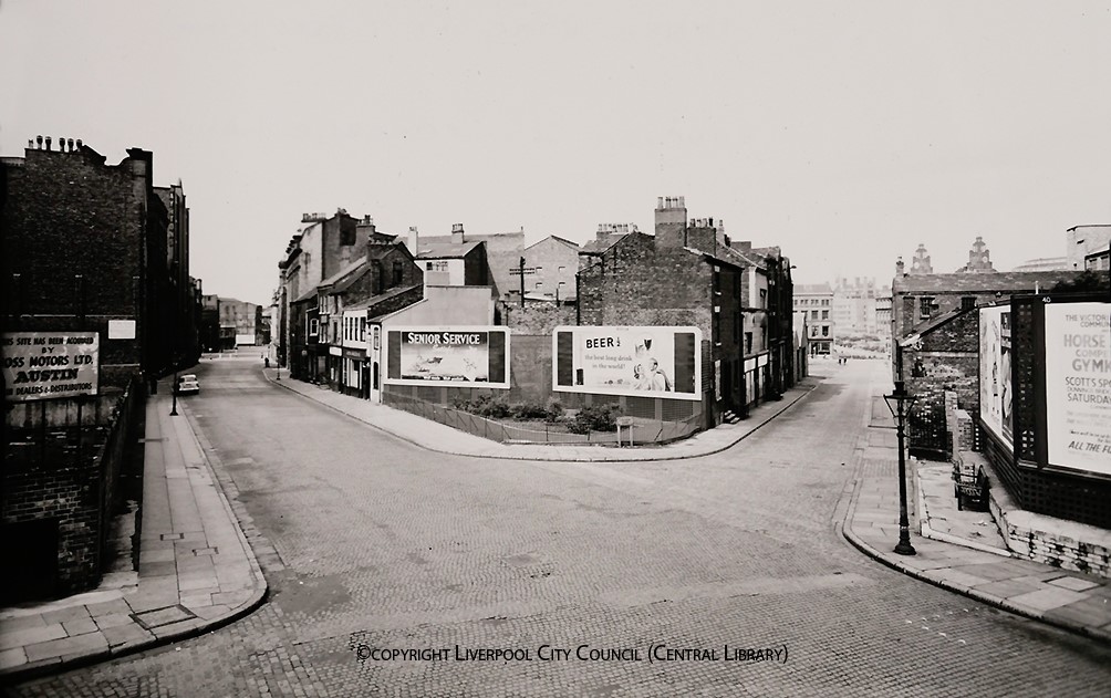Hardly recognisable now, this scene at the junction of Hanover Street and College Lane was taken by a photographer from the City Engineer and Surveyor’s Department on 27th July 1958. To the left the street snakes down towards Duke Street, Canning Place and Wapping. To the right, College Lane leads to Paradise Street. The majority of what you can see now forms part of the giant Liverpool ONE development. However, a few of the old buildings on the left of College Lane still exist, one of which is a barber’s shop; to the right, you can see the rear entrance of Bluecoat Chambers. At the top of the street is an old fashioned gas lamp: at that time the Corporation employed some 600 lamplighters at its depot in Highfield Street but their days were numbered.