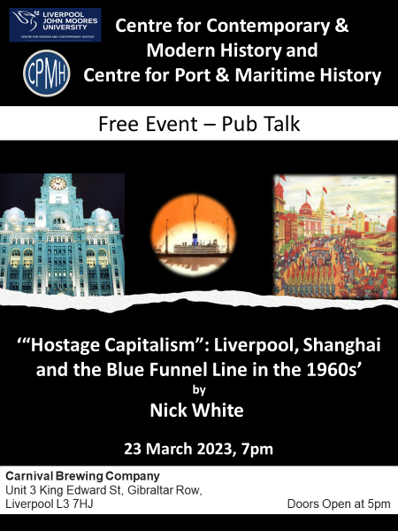 The LJMU Centre for Modern and Contemporary History and Centre for Port and Maritime History are holding a public-facing event on Thursday 23 March, 7pm at the Carnival Brewing Company (L3 7HJ). Professor Nick White will be speaking on the theme of ‘“Hostage Capitalism” Liverpool, Shanghai and the Blue Funnel Line in the 1960s’ (abstract below).